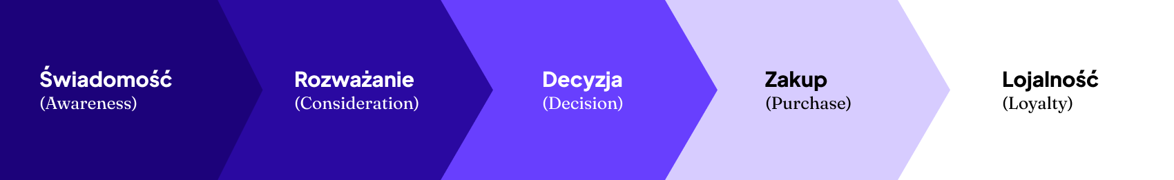 Customer journey składa się z 5 następujących etapów: Świadomość (Awareness), Rozważanie (Consideration), Decyzja (Decision), Zakup (Purchase) i Lojalność (Loyalty)