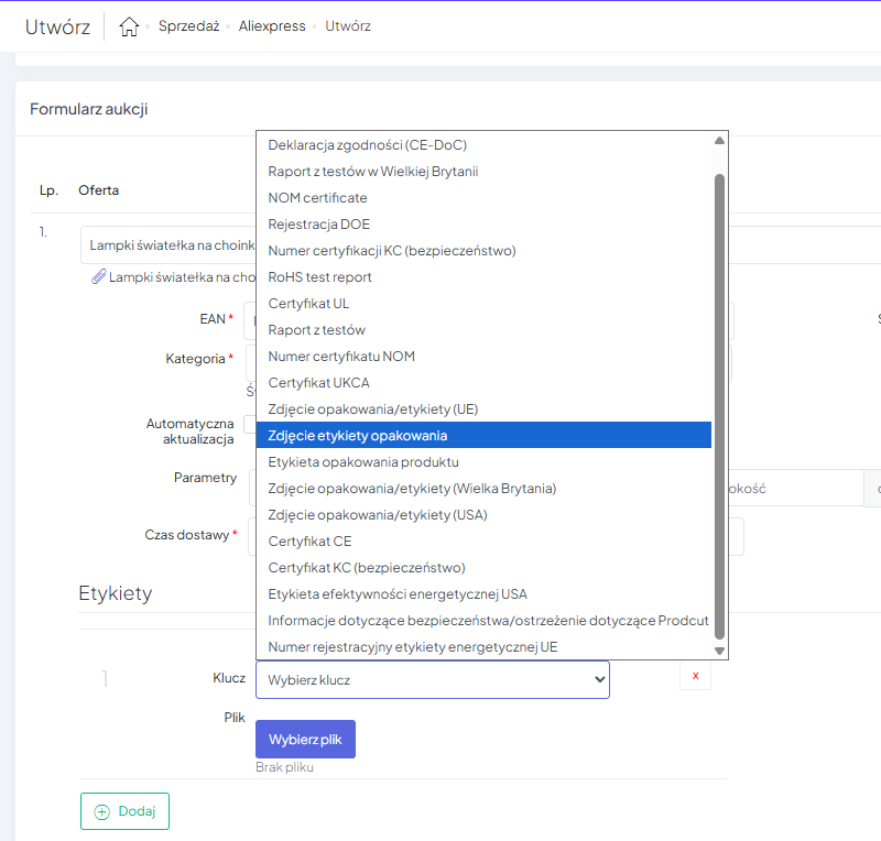 Aby dodać wymagane zdjęcia w formularzu wystawiania najpierw wybierz kategorię produktu, a następnie pojawi się pole „Etykieta”: