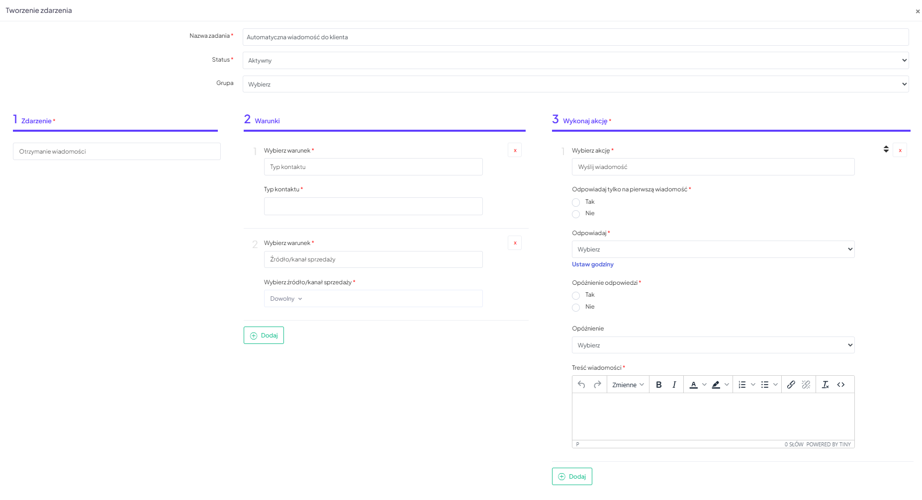 Jeżeli chcesz ustawić różne odpowiedzi dla dyskusji i wiadomości konieczne będzie stworzenie 2 zadań automatycznych. Możesz również wybrać oba typy – wysyłana będzie ta sama odpowiedź