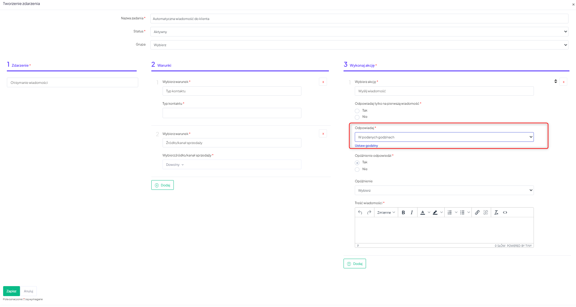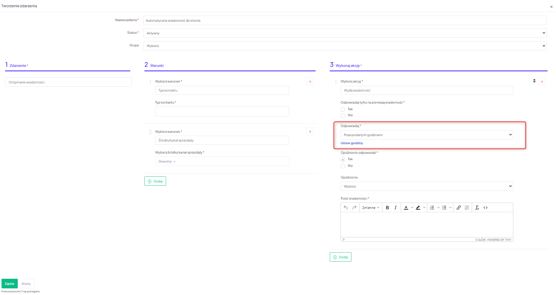 • Opóźnienie odpowiedzi – ustaw Tak, gdy odpowiedź ma zostać wysłana z opóźnieniem
