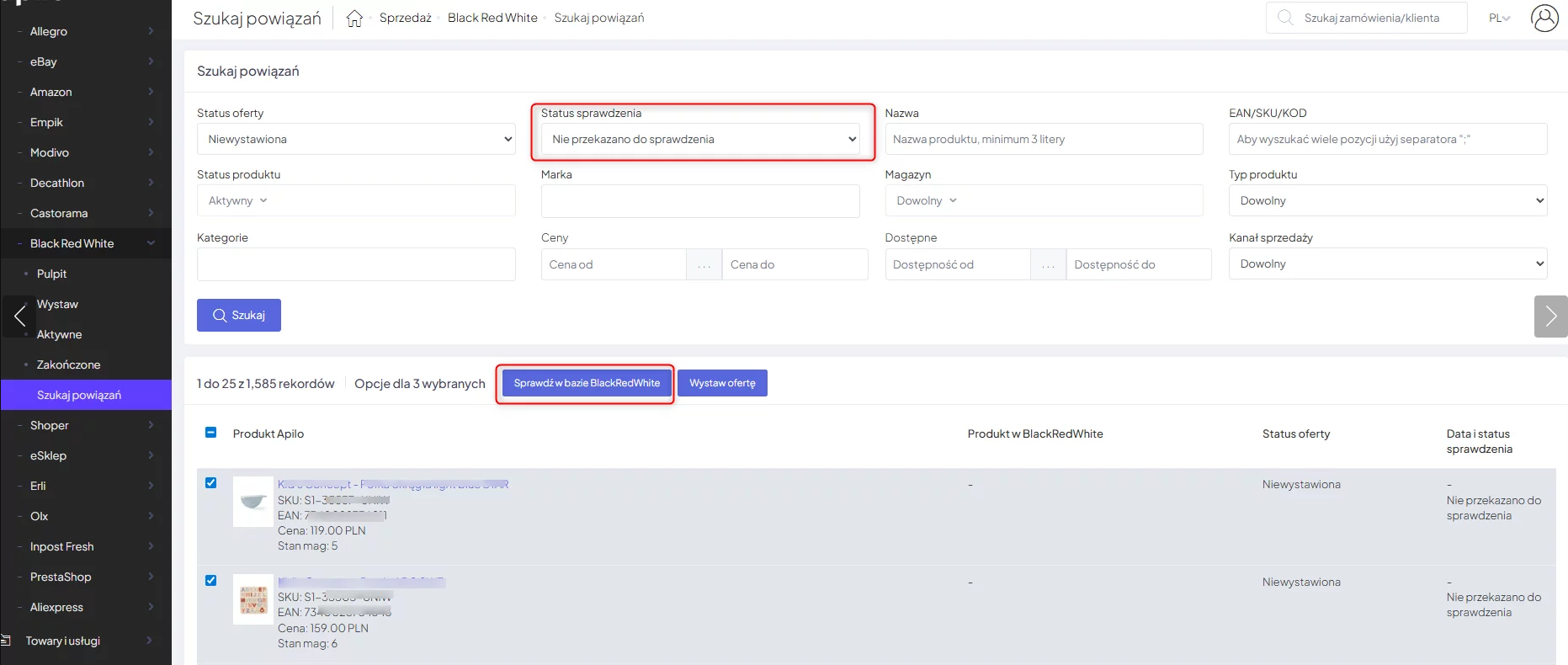 - Znajdź powiązania EAN między produktami w magazynie Apilo, a bazą BRW w zakładce Sprzedaż → BRW → Szukaj Powiązań