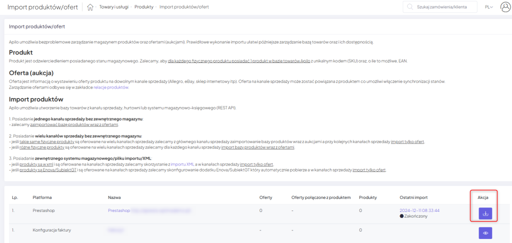1. Przejdź w panelu Apilo do Towary i usługi > Produkty > Przycisk Importuj w prawym górnym rogu > Platformy.