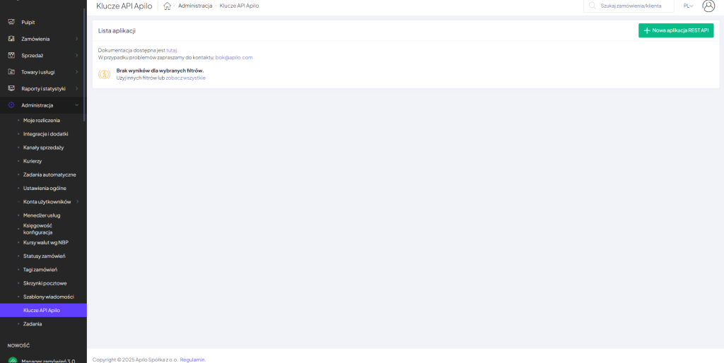 Następnie przejdź do zakładki Administracja -> Klucze API Apilo -> Dodaj nowy klucz API klikając w prawym górnym rogu w przycisk “Nowa aplikacja REST API”