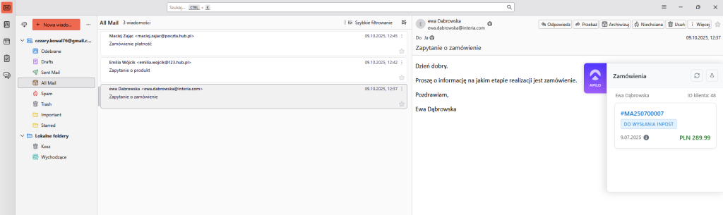 Po otrzymaniu nowej wiadomości wejdź w zakładkę “odebrane” i kliknij w wybrany mail. Po prawej stronie pojawi się wiadomość od klienta wraz z rozwijanym przyciskiem “APILO”.