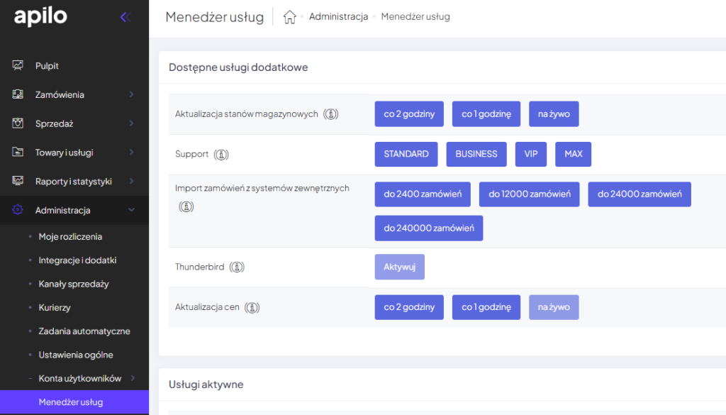 Zaloguj się na swoje konto Apilo i przejdź do zakładki Administracja -> Menedżer usług. Przy „Thunderbird” kliknij przycisk „aktywuj”: