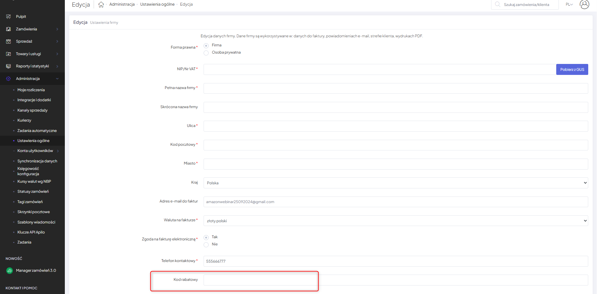 Jeśli jesteś już klientem Apilo, posiadasz konto w systemie i chcesz aktywować kod rabatowy to musisz przejść do strony zarządzania firmą. Aby to zrobić należy wybrać z menu Administracja -> Ustawienia ogólne -> Ustawienia firmy.