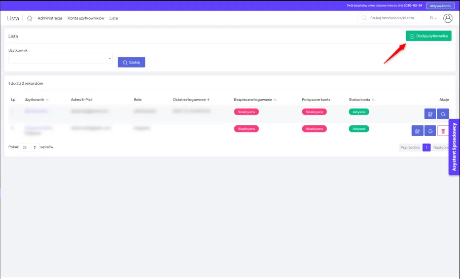1. Przejdź do zakładki Administracja -> Konta użytkowników -> Lista.