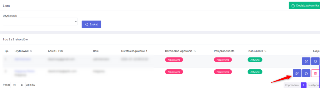 2. Po prawej stronie każdego użytkownika są dostępne przyciski, aby zmienić uprawnienia należy kliknąć przycisk z napisem Edycja.