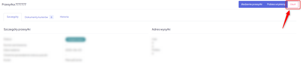 2. Kliknij w numer przesyłki i w prawym górnym rogu przycisk Usuń.