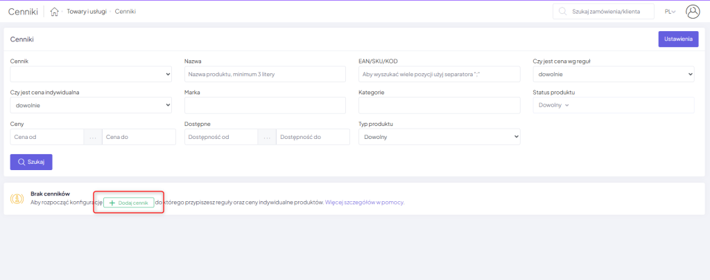 3. Upewnij się, że dodałeś przynajmniej 1 cennik, następnie dodaj regułę cenową (klik 2).