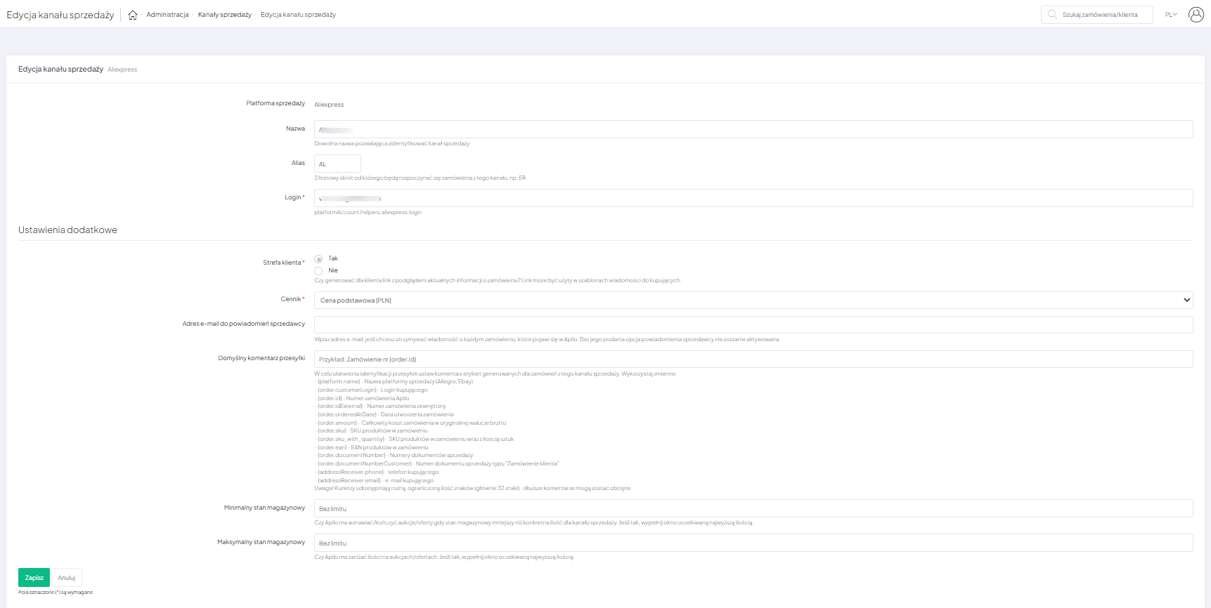 Tipp: Po zmianie hasła na Aliexpress należy ponownie przeprowadzić autoryzację powiązania Apilo z Aliexpress w zakładce Administracja > Kanały sprzedaży > klik w nazwę konta Aliexpress > Autoryzacja.
