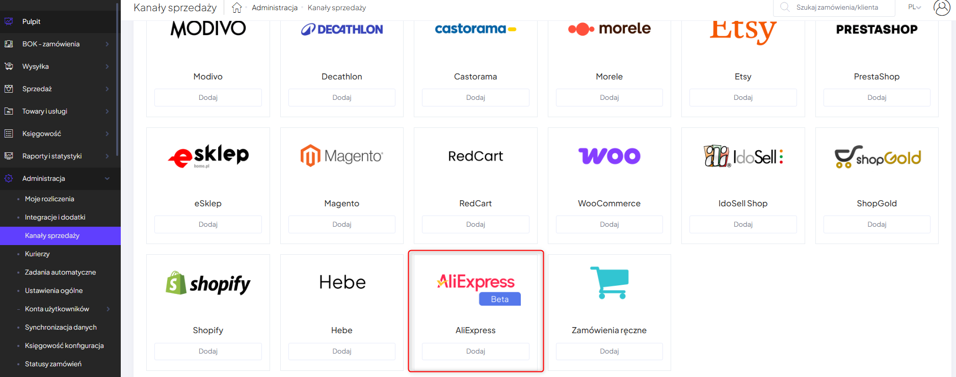 Na początku zaloguj się do Apilo jako administrator i przejdź do zakładki Administracja > Kanały sprzedaży. Z listy dostępnych sklepów wyszukaj “Aliexpress” i kliknij przycisk Dodaj