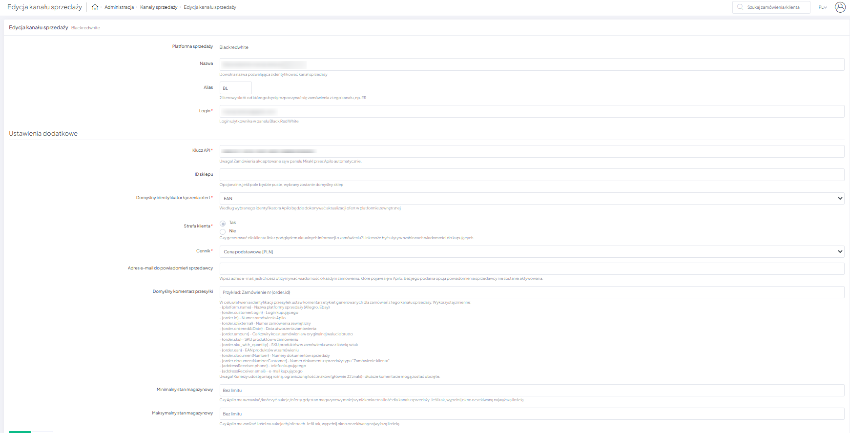 - Klucz API – skopiowany z panelu BRW. Uwaga! Zamówienia akceptowane są w panelu Mirakl przez Apilo automatycznie