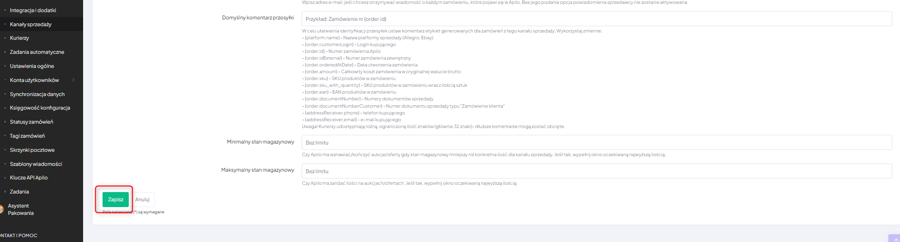 - Adres e-mail do powiadomień sprzedawcy – Wpisz adres e-mail, jeśli chcesz otrzymywać wiadomość o każdym zamówieniu, które pojawi się w Apilo Bez jego podania opcja powiadomienia sprzedawcy nie zostanie aktywowana