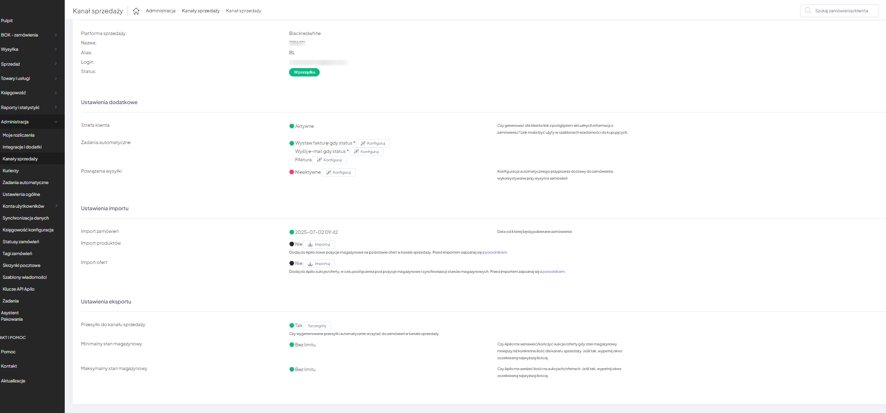 Aby przejść do dalszej konfiguracji kanału sprzedaży należy przejść do zakładki: Administracja -> Kanały sprzedaży -> BRW – kliknij w nazwę podłączonego konta.