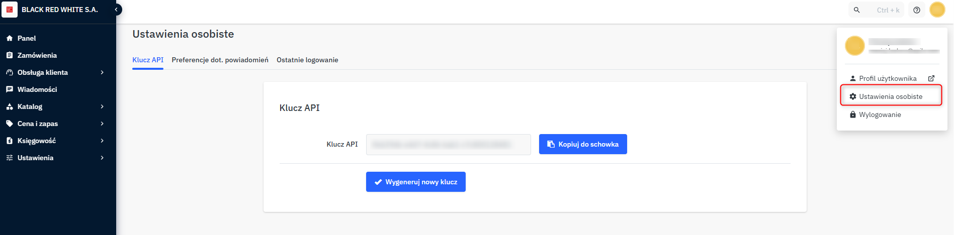 – Klucz API nie został wygenerowany- wybieramy „Wygeneruj nowy klucz” > „Kopiuj do schowka”.