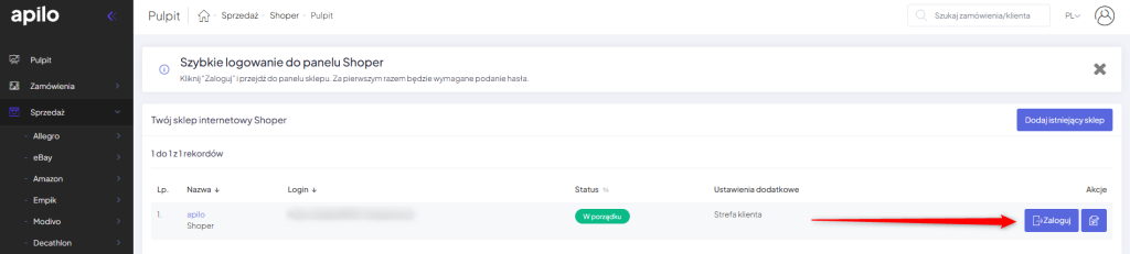 Możesz szybko przejść z Apilo do Shoper wchodząc w zakładkę Sprzedaż -> Shoper -> Pulpit. Po kliknięciu w przycisk „zaloguj” zostaniesz przekierowany do strony Shoper.