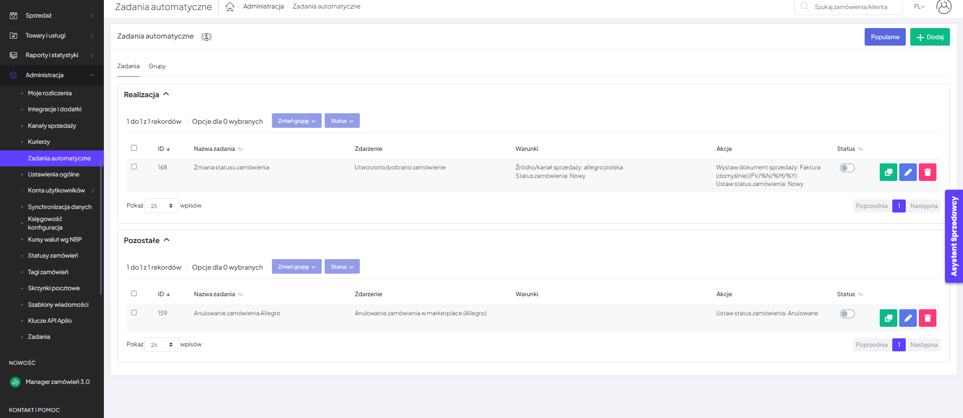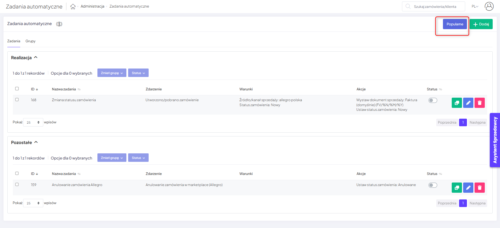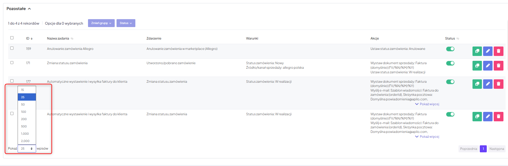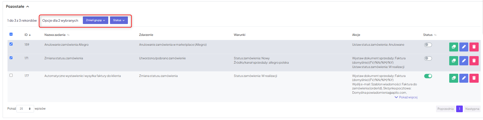 System umożliwia masowe zarządzanie wybranymi zadaniami automatycznymi, w tym ich przenoszenie do dedykowanej grupy oraz zbiorczą zmianę statusu. Aby tego dokonać zaznacz interesujące Cię zadania i wybierz dla nich preferowaną opcję: