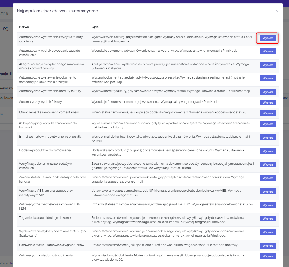- Przy wybranym schemacie automatyzacji, kliknij przycisk „Wybierz”.