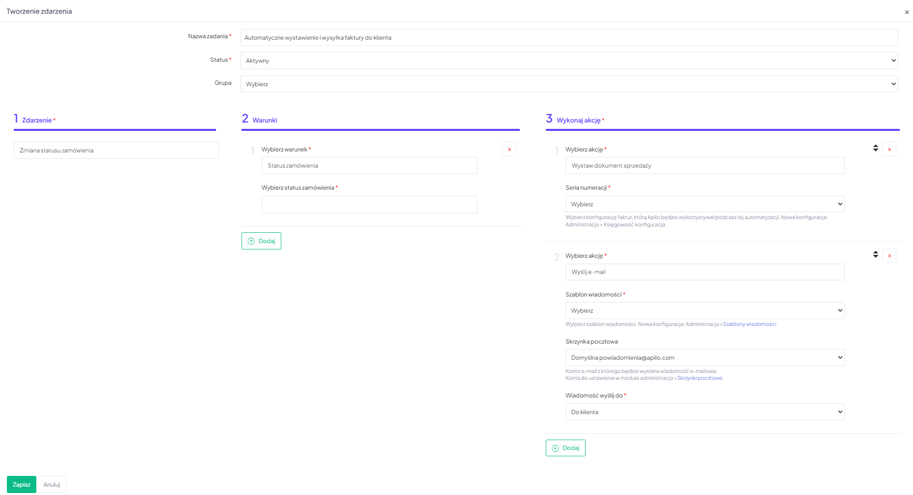- Akcji: Jest to finalne zadanie, które system wykonuje, jeśli zdarzenie zaszło i warunki zostały spełnione.