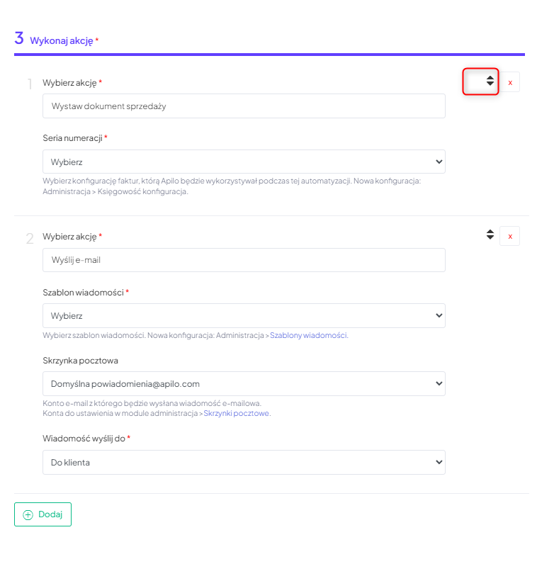 WAŻNE: W polu numer 3. „Wykonaj akcję” dostępny jest suwak, umożliwiający łatwą zmianę i ustalenie optymalnej kolejności wykonywanych działań.