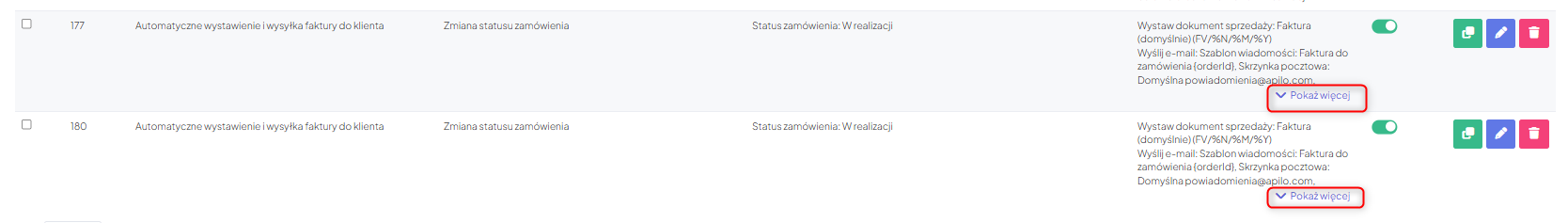 Zadania automatyczne widoczne na liście z większą ilością warunków lub akcji niż 4 posiadają opcję rozwinięcia dalszych pozycji: