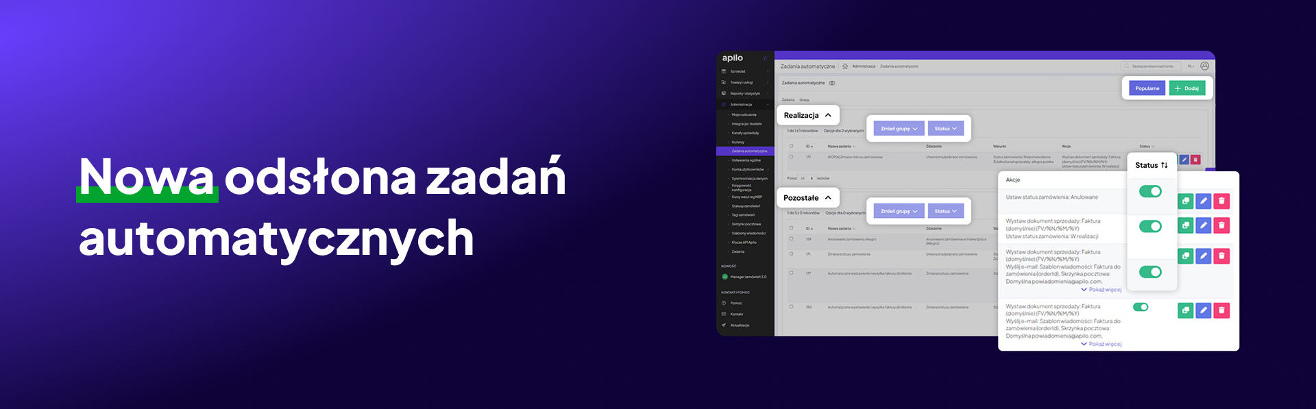 Ostatni kwartał roku w Apilo zaczęliśmy z przytupem – oddając w Twoje ręce całkowicie nową odsłonę Zadań Automatycznych. Co więcej, październik obfitował w dziesiątki aktualizacji i usprawnień, które zwiększają Twoją wygodę, ale też przepustowość, bezpieczeństwo i wydajność codziennych procesów obsługiwanych dla Ciebie w Apilo. Zobacz, co konkretnie dla Ciebie przygotowaliśmy!
