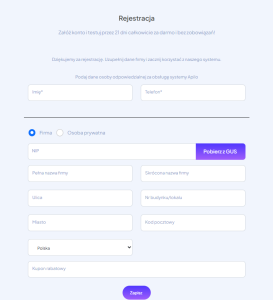 Kolejnym etapem jest podanie niezbędnych informacji dotyczących firmy. Należy podać informacje dot. osoby odpowiedzialnej za obsługę systemu – jest to numer telefonu i własne imię. Kolejnym etapem jest wprowadzenie NIP, nazwy firmy oraz dane teleadresowe.